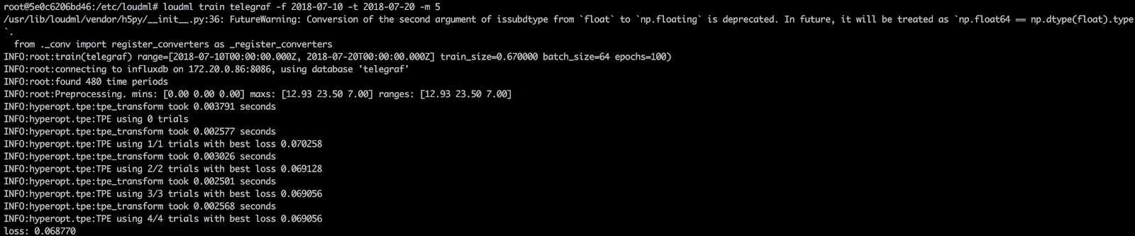 loudml train telegraf -f 2018-07-10 -t 2018-07-20 -m 5