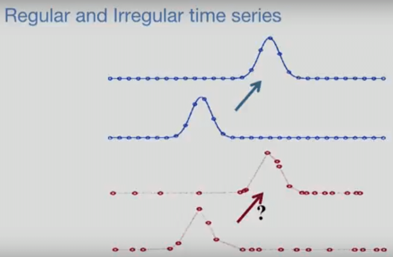InfluxDB has a large user base and a large community. Used in combination with the other InfluxData platform components discussed below, it creates a full-stack monitoring system. InfluxDB supports irregular time series (events occurring at irregular time intervals) and regular time series (metrics occurring at regular time intervals), as shown below.