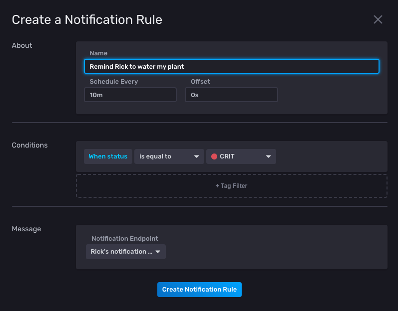 Now that I have a check and a notification endpoint, I can define my notification rule. I set the rule to check the status every 10 minutes, and notify Rick whenever my plant’s soil_moisture