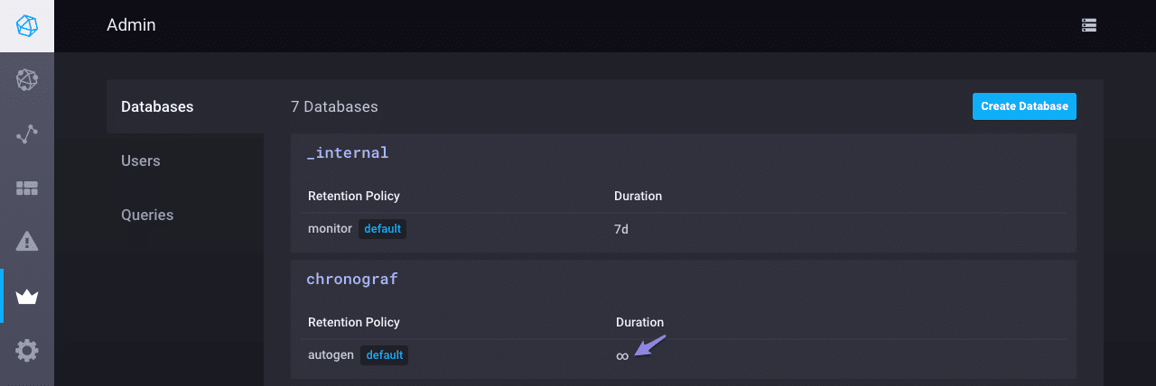 We recommend using Chronograf’s Admin page to modify the retention policy in the chronograf database. In the Databases tab: