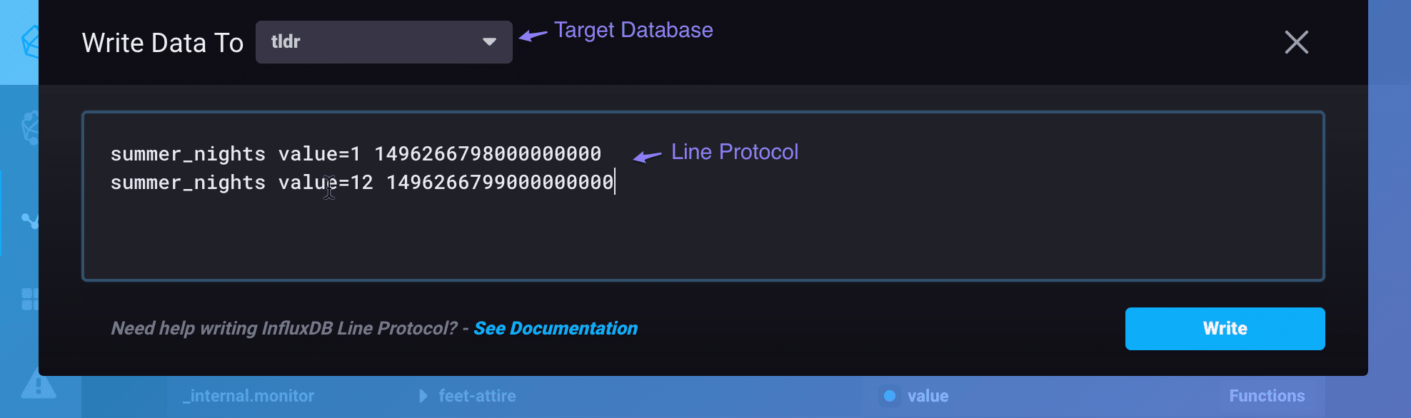 To write data with Chronograf, click the Write Data icon at the top of the Data Explorer page and select your target database. Next, enter your line protocol in the main text box and click the Write button.