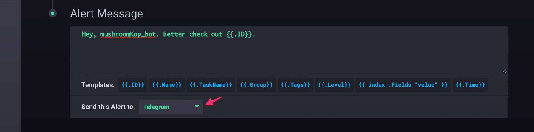 When creating or editing a rule on Chronograf’s Kapacitor Rules page, select telegram in the dropdown menu at the bottom of your screen. Kapacitor sends all alert messages associated with that rule to your configured Telegram bot.