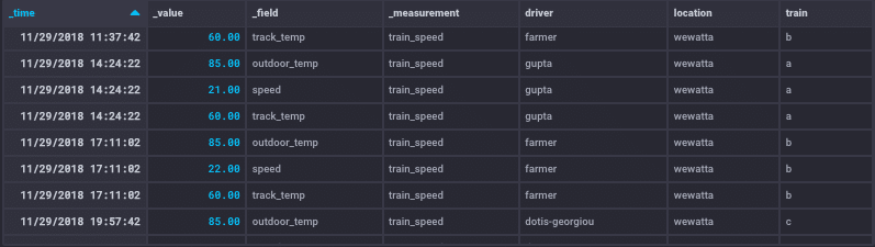 In the last post, I used a measurement called cpu_load_short with various tags and fields. In this post I’ve seeded my InfluxDB database, called trains, with train data. The measurement is train_speed. My tags are driver, location, and train. My fields are outdoor_temp, speed, and track_temp. Below you can see a sample of data for three different drivers.
