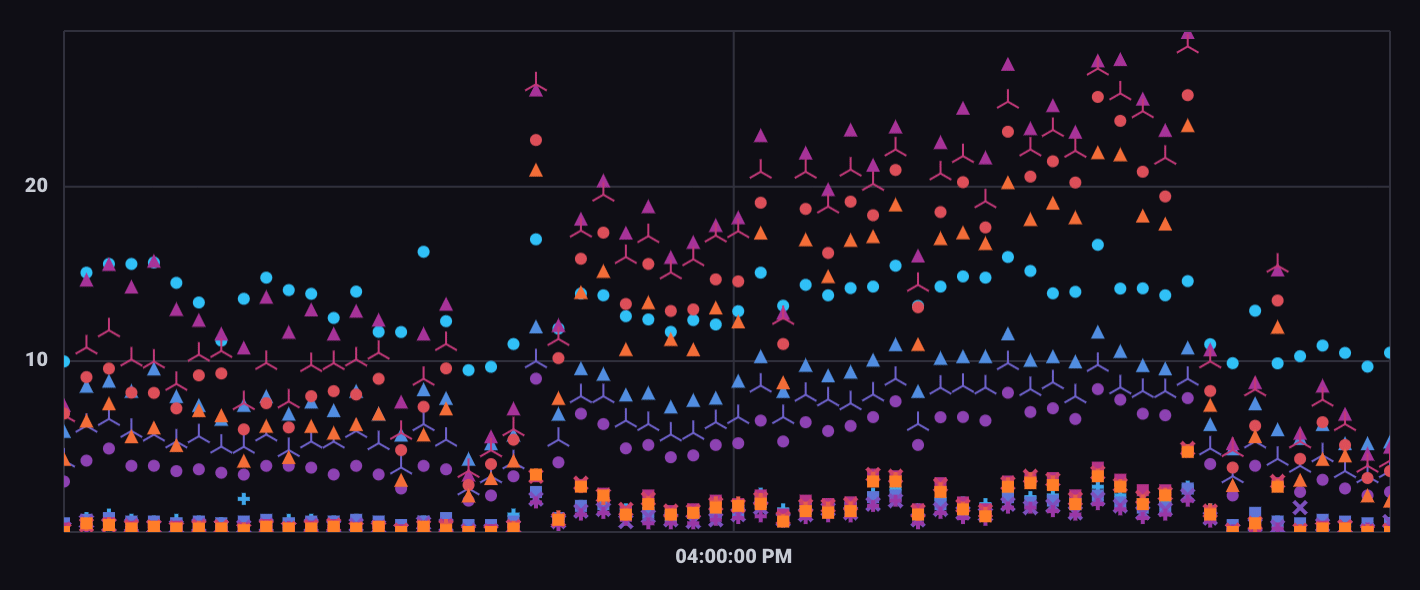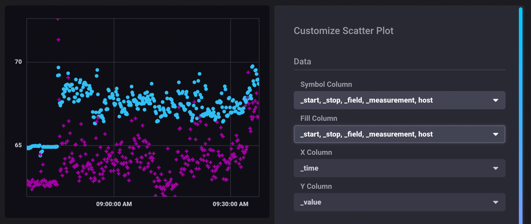 The following example explores possible correlation between CPU and Memory usage. In the Scatter visualization controls, points are differentiated based on their group keys.