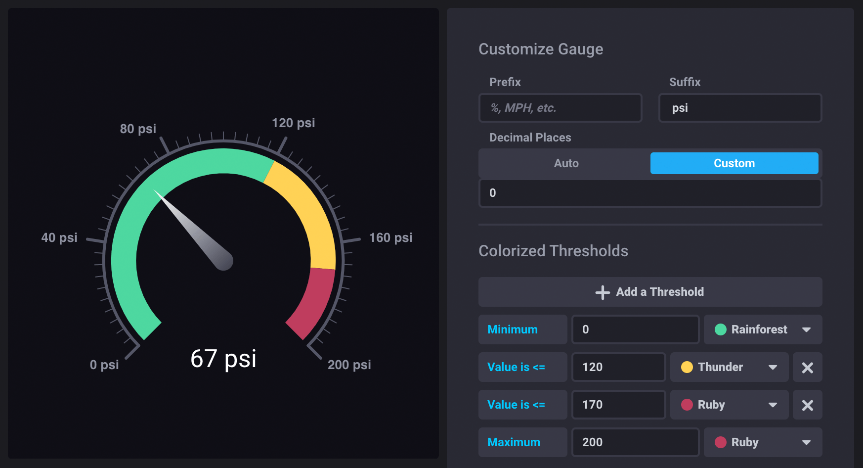 The Gauge view displays the single most recent value for a time series in a gauge view. Gauge visualizations are useful for showing the current value of a metric and displaying where it falls within a spectrum.