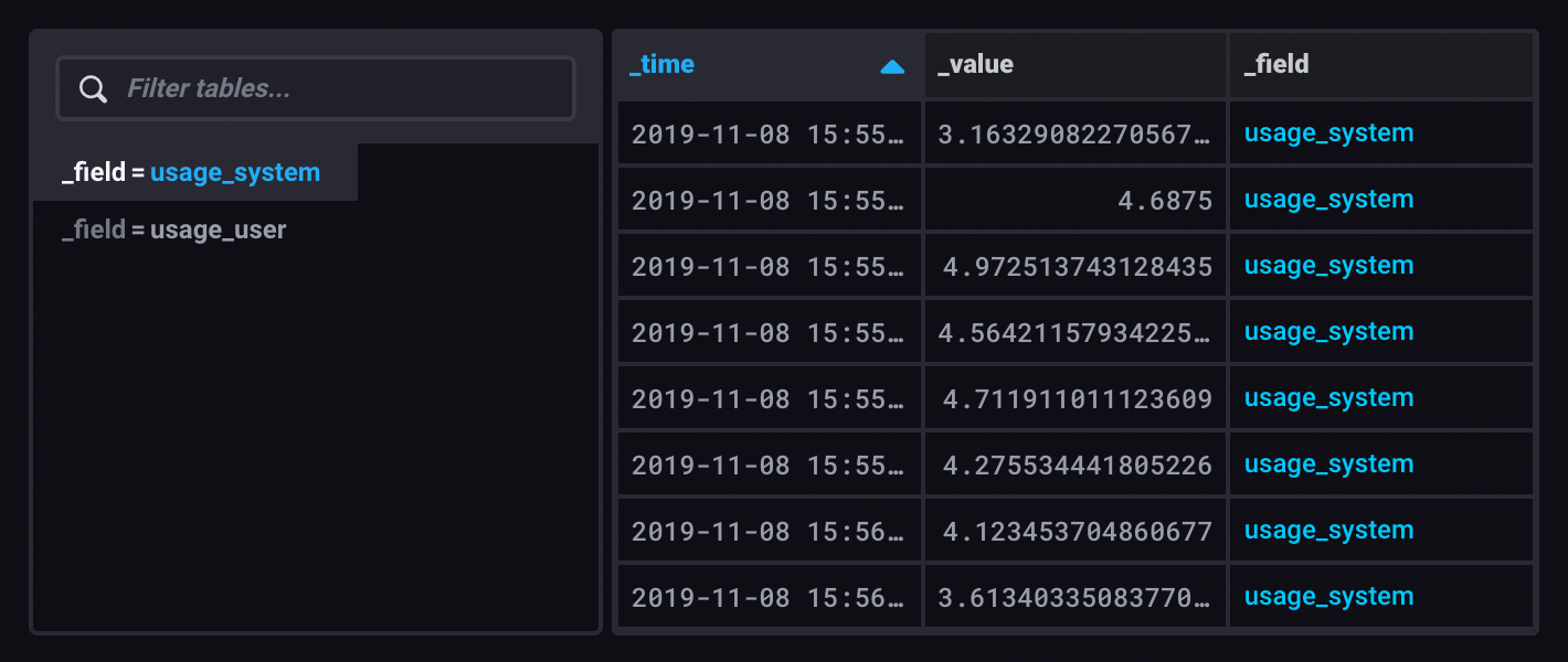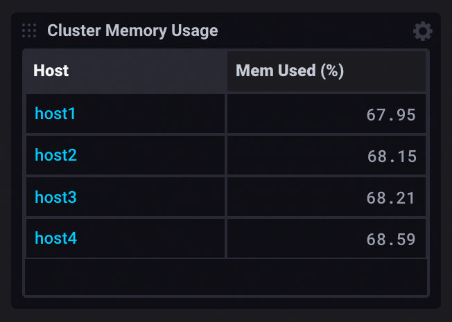 The table visualization renders queried data in structured, easy-to-read tables. Columns and rows match those in the query output. Tables are helpful when displaying many human-readable metrics in a dashboard such as cluster statistics or log messages.