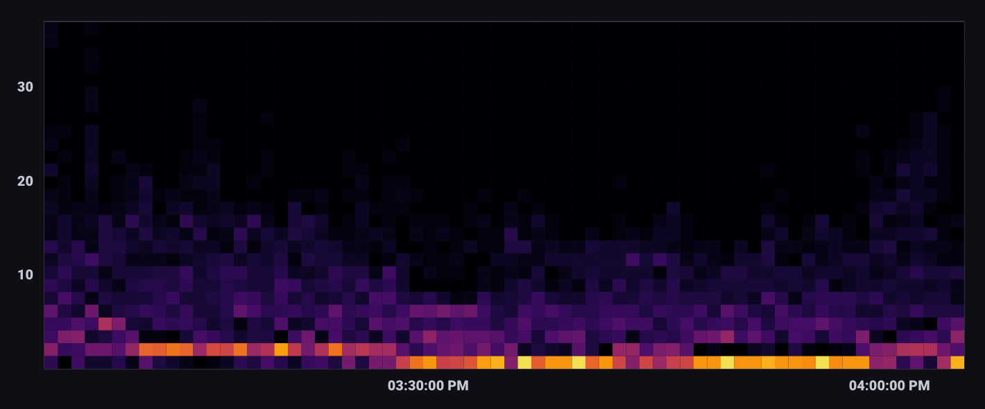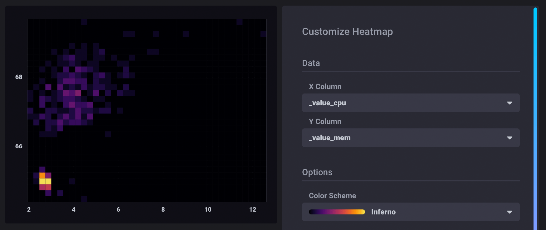 A Heatmap displays the distribution of data on an x and y axes where color represents different concentrations of data points. Heatmaps divide data points into “bins” – segments of the visualization with upper and lower bounds for both X and Y axes. The Bin Size option determines the bounds for each bin. The total number of points that fall within a bin determine its value and color. Warmer or brighter colors represent higher bin values or density of points within the bin.
