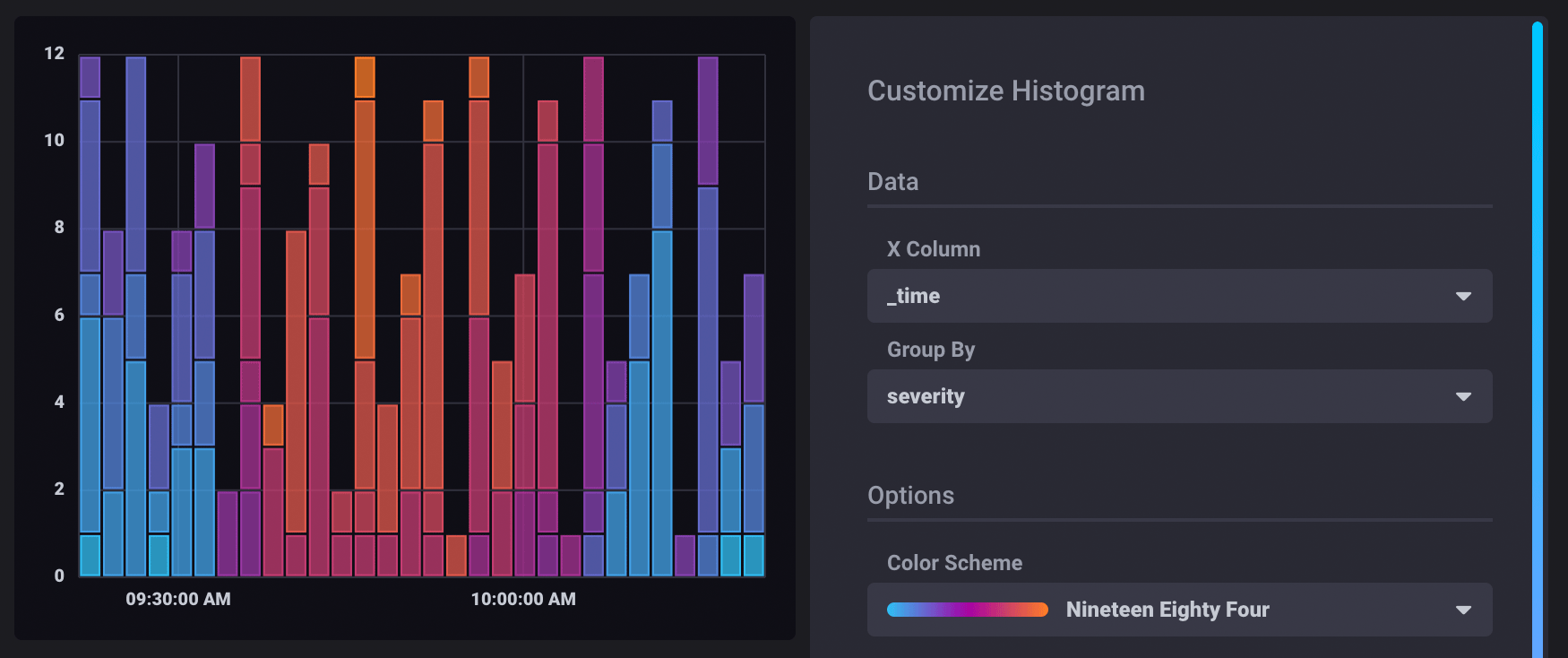 For example, the below histogram shows error counts by severity over time.