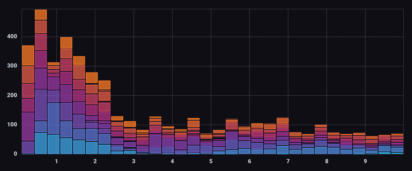 A histogram is a way to view the distribution of data. The y-axis is dedicated to count, and the x-axis is divided into bins. The Histogram visualization is a bar graph that displays the number of data points that fall within “bins” – segments of the X axis with upper and lower bounds.
