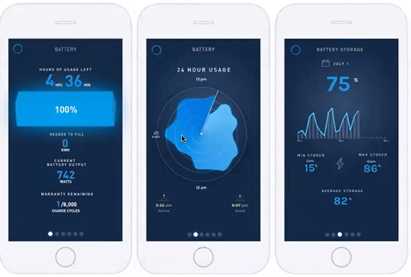 The above graphs, respectively, show the amount of energy stored in the solar battery (of a Blue Planet Energy storage unit that allows buildings equipped with solar panels to store unused solar energy); battery consumption over a 24-hour period; and battery storage over time (which gives users different time increments to query from).