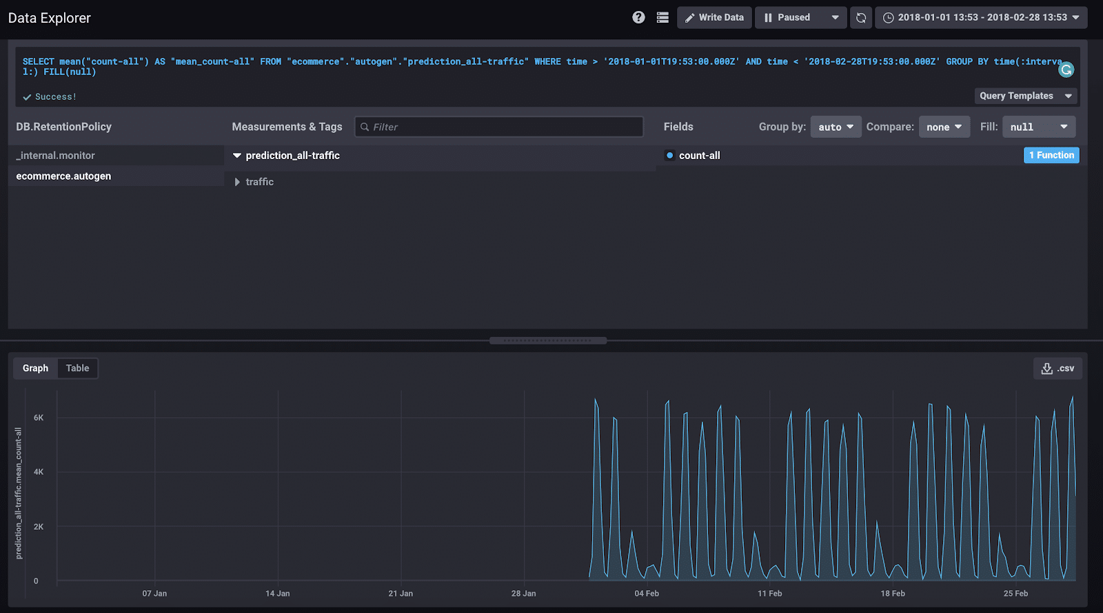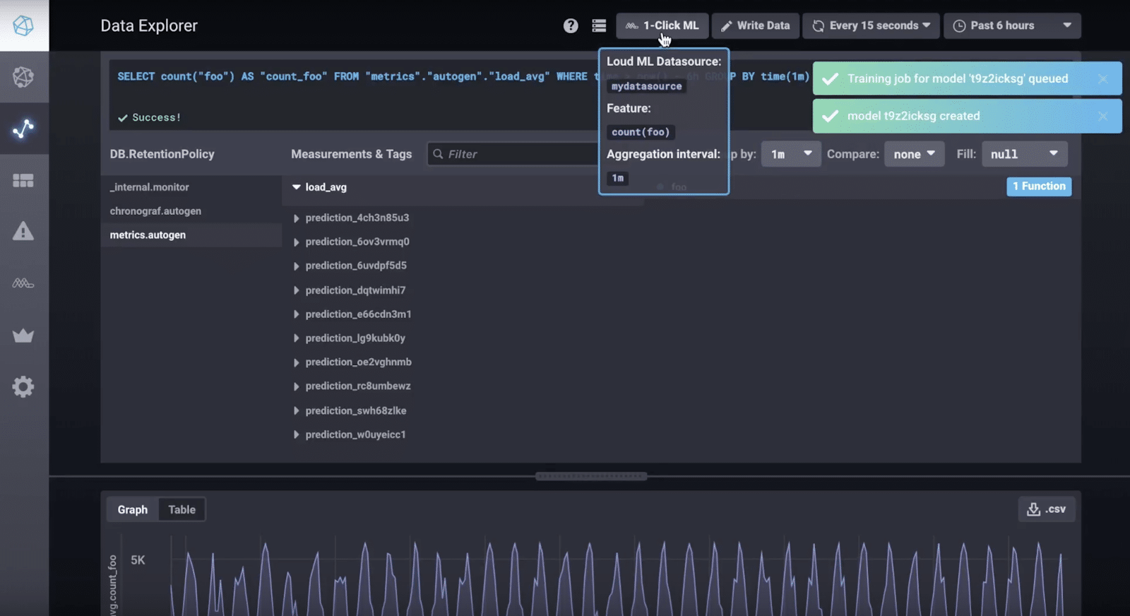 One thing I love about InfluxData is our open source offerings. Our community has grown tremendously because the OSS versions of the TICK Stack are powerful and versatile. Telegraf has over 160 plugins, 153 of which were written by community members. Researchers at CERN used the OSS version to help them “determine the fundamental structure of the universe”. Loud ML is another exemplary community success story. Loud ML has forked InfluxData’s repo and added 1-Click Machine Learning to Chronograf to support the configuration and deployment of their machine learning models. Loud ML makes applying ML models to your time series data incredibly easy. By contrast, if I decided to use TensorFlow by itself, I would have to select a model, evaluate it, and tune it. That’s a lot of work and requires a deep understanding of ML for time series data. Fortunately, I don’t have to understand anything about ML to create high-performing models and evaluate them using Loud ML. With 1-Click Machine Learning, you can create and train a model with the click of a button. You simply query your data, apply a feature and aggregation interval, and click to predict.