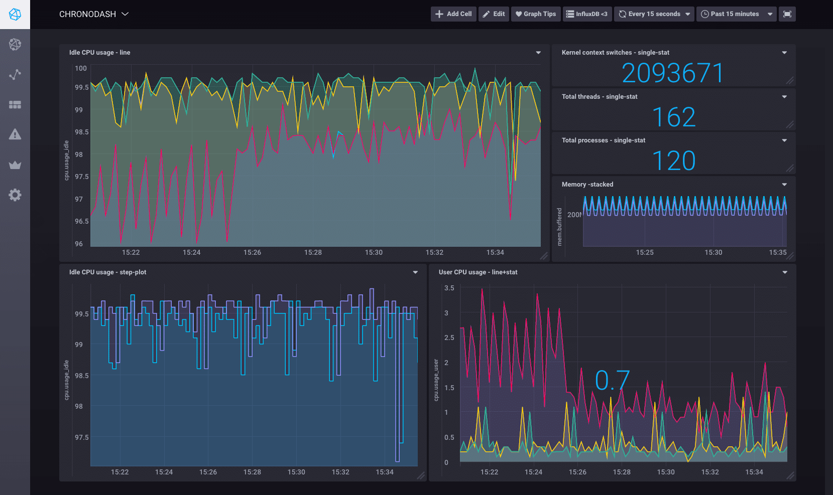 Create beautiful, customized dashboards with Chronograf’s latest addition: the DASHBOARDS page. Version 1.2.0-beta7 combines the sleekness of Chronograf’s pre-created dashboards with the practicality of the data explorer to create a fully functional environment for creating, editing, and viewing customized dashboards.