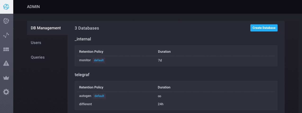 The ADMIN page, introduced back in version 1.2.0~beta5, has a new tab in version 1.2.0-beta7. The DB Management tab manages the databases and retention policies on your InfluxDB instance.