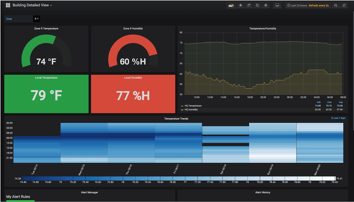 This KPI Dashboard displays the temperature and humidity for each building zone. Users can click any panel to drill down to a detailed dashboard for a specific building zone.