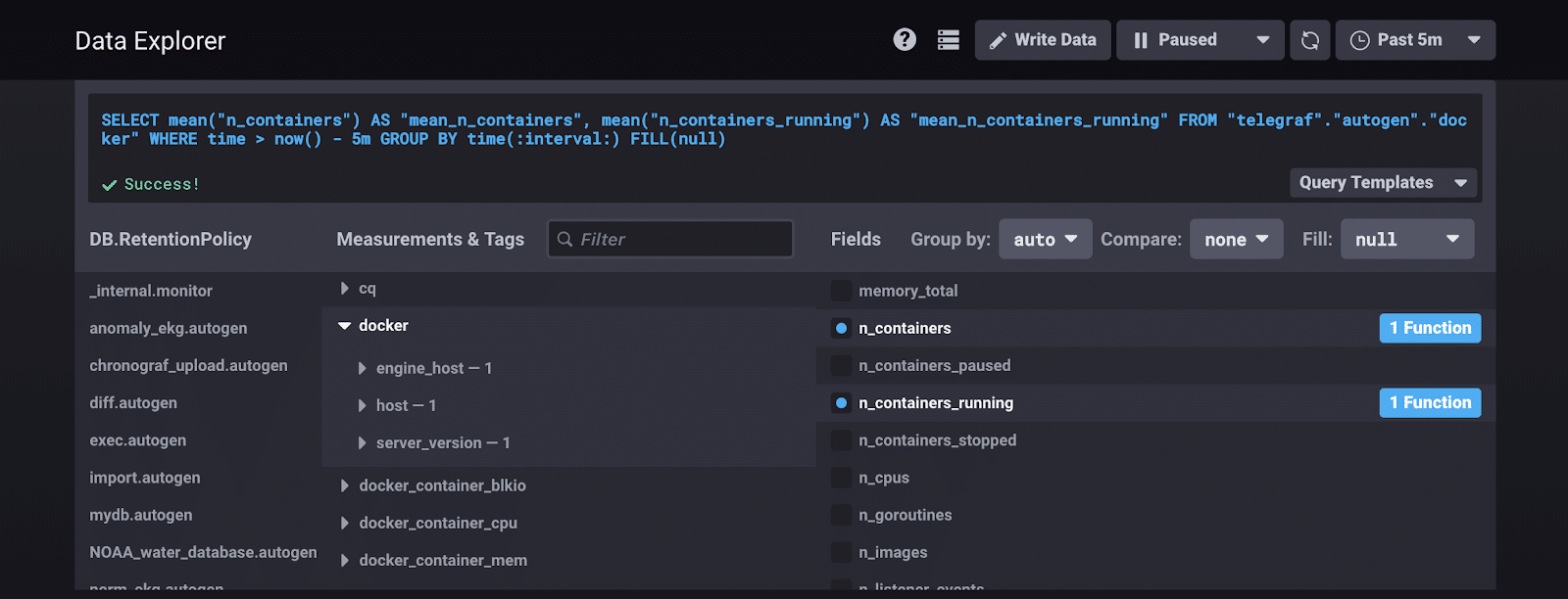 This proxy test will also enable me to see if Telegraf is successfully gathering metrics from my containers. I visit http://localhost:8888 to pull up Chronograf, InfluxData’s open source data visualization and alert management platform. In the default database called “telegraf”, I can now see all of my docker metrics. I run this query…