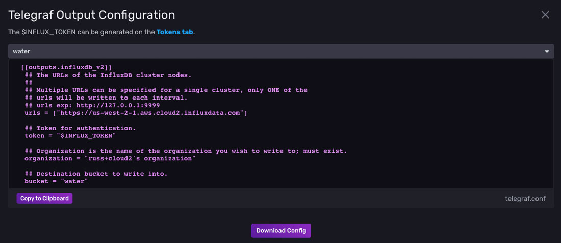 I already have a free InfluxDB Cloud account, so I opened up my browser, and jumped into the Load Data > Telegraf section of the UI. I grabbed the Output plugin configuration from the UI and added it into my Telegraf config. I was able to generate an API token via the browser as well.