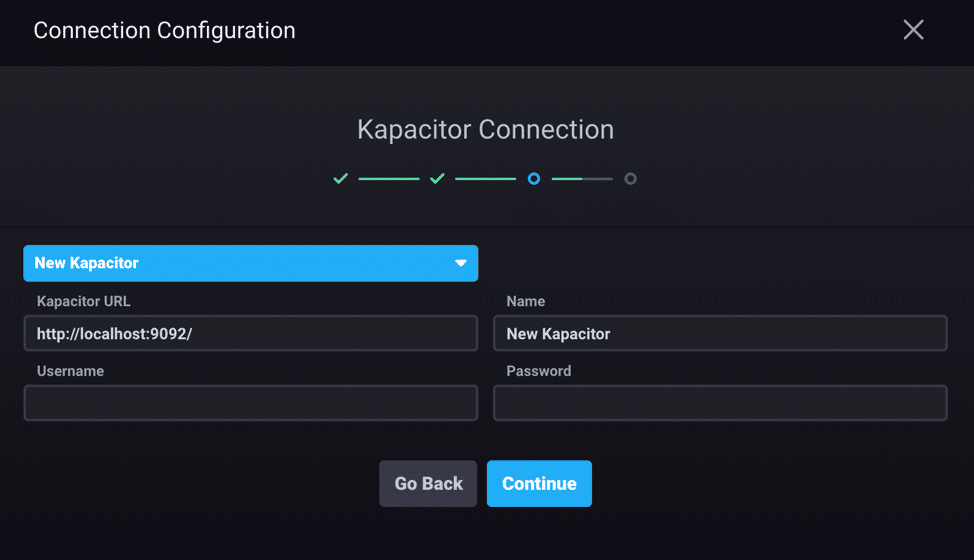 All that’s left in the onboarding is to set up Kapacitor, but we can leave the defaults in place for now and continue onward.