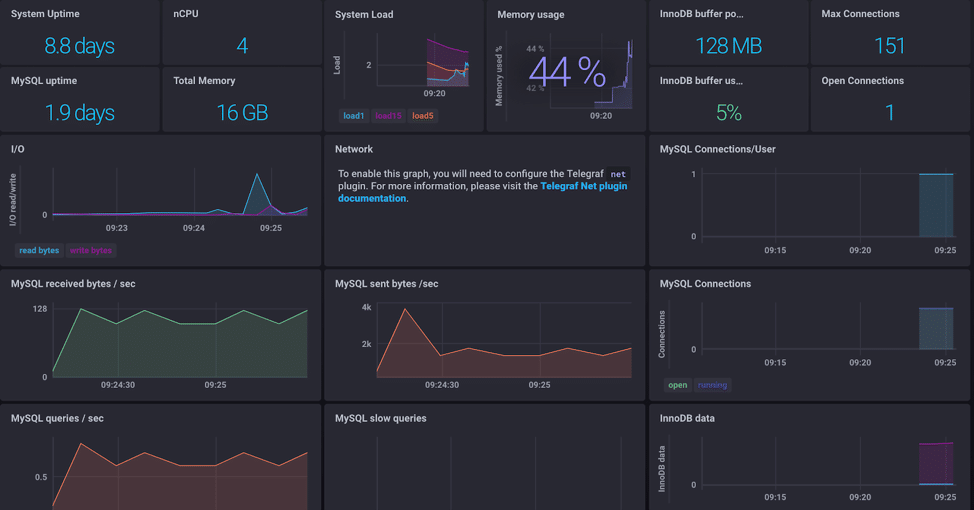 Metrics about the database live in the internal performance database, which for MySQL is the performance_schema database (and the more human-readable sysdatabase). Now, we could query this database to find what we’re looking for, but we can expedite this process by using the Telegraf MySQL plugin to send those metrics straight to InfluxDB. If you’re thinking that it sounds silly to send metrics from one database to another, you’re right but not if our plan is to keep that data long-term or build useful visualizations from it. Keep in mind that what we want is a dashboard to view when things are behaving dangerously.