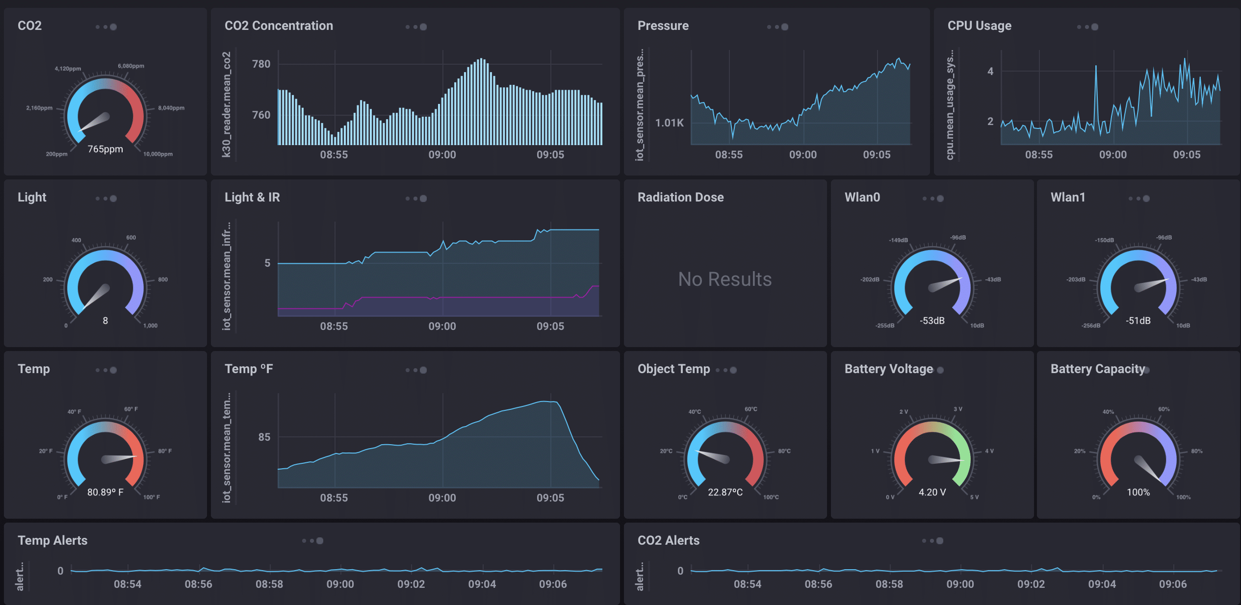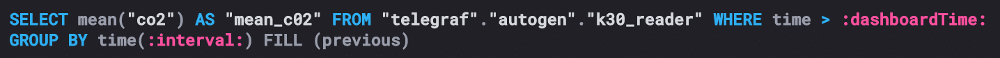 That’s all the sensor datawell, the radiation sensor is off-line right nowand how it looks on-screen. Each of those dashboard elements is created and updated via an InfluxQL query via Chronograf. So let’s look at some of the queries and what they look like in the Chronograf Dashboard Builder today. We’ll start with that CO2 reading at the upper left: