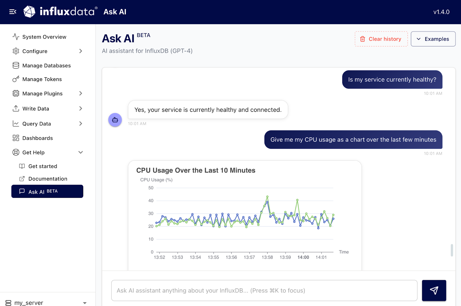 Version 1.4 of our Explorer UI includes Ask AI, a new beta feature that brings natural language to time series analysis. Plug in your API key, and Ask AI lets you query your data, documentation, and system operations conversationally, with no SQL required.