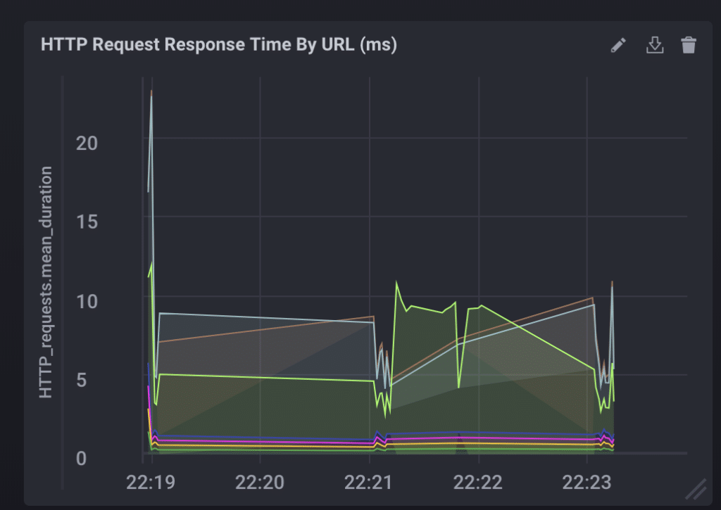 Here, you’ll see I built out a stacked graph visualizing mean HTTP request/response duration in milliseconds, grouped by different URLs: