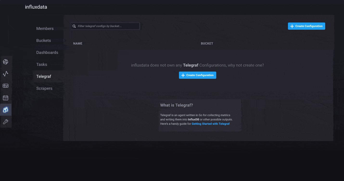 For those of you who prefer to push your metrics into InfluxDB, you can continue to use the Telegraf collection agent. We’ve made it easier than ever to create Telegraf configurations and distribute the agents wherever they are needed. We’ve added a Telegraf agent configuration option in the InfluxDB 2.0 user interface. This allows you to quickly build a Telegraf configuration file and best of all, InfluxDB 2.0 stores the configuration so Telegraf 1.9 (or above) can pull it remotely. It’s the fastest and easiest way to build a Telegraf agent configuration.