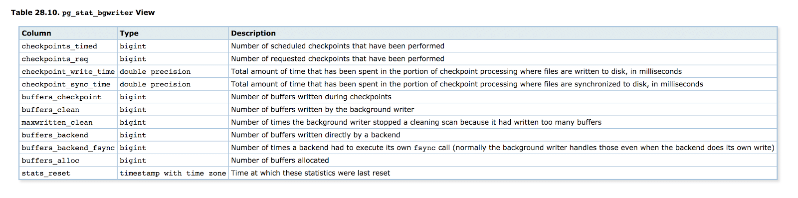 If your data is pretty important to you, then you’re probably keeping multiple copies of it (so you don’t lose it all in the event of a crash) and you want it to be highly available at all times. This is where the pg_stat_bgwriter view can make a big difference. It tracks a number of checkpoint metrics.