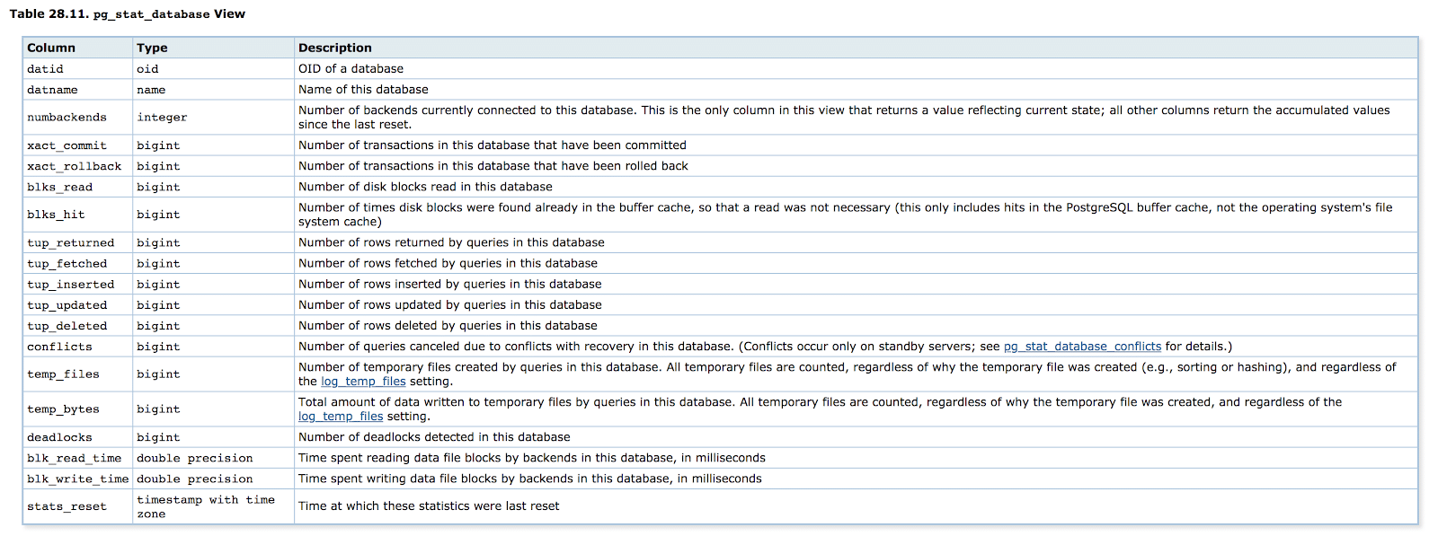 Take a look at tup_returned, the number of rows read or scanned versus tup_fetched, the number of rows fetched that contained data necessary to execute the query successfully. These two variables should consistently stay pretty close in number, which would point to the database carrying out read queries efficiently, since it wouldn’t be scanning through extra rows to satisfy the query requirements. Additionally, you may want to track temp_files and temp_bytes, since PostgreSQL sometimes has to write data temporarily to disk in order to successfully execute various queries (if there is not enough memory available). High numbers in this area indicate a potentially increasing number of resource-draining queries.