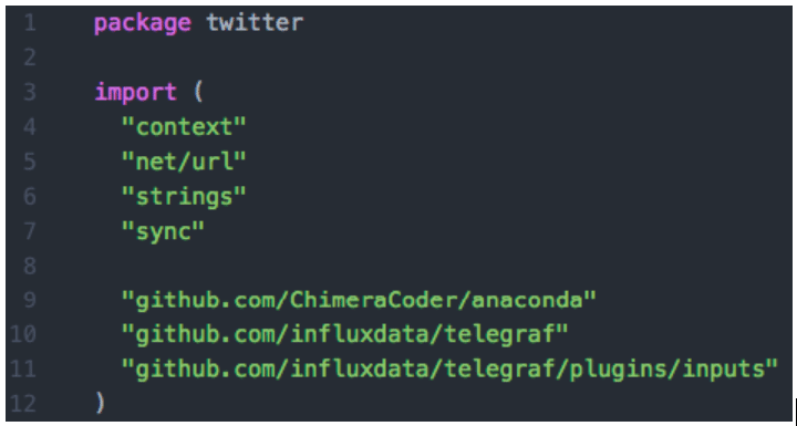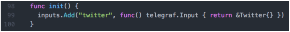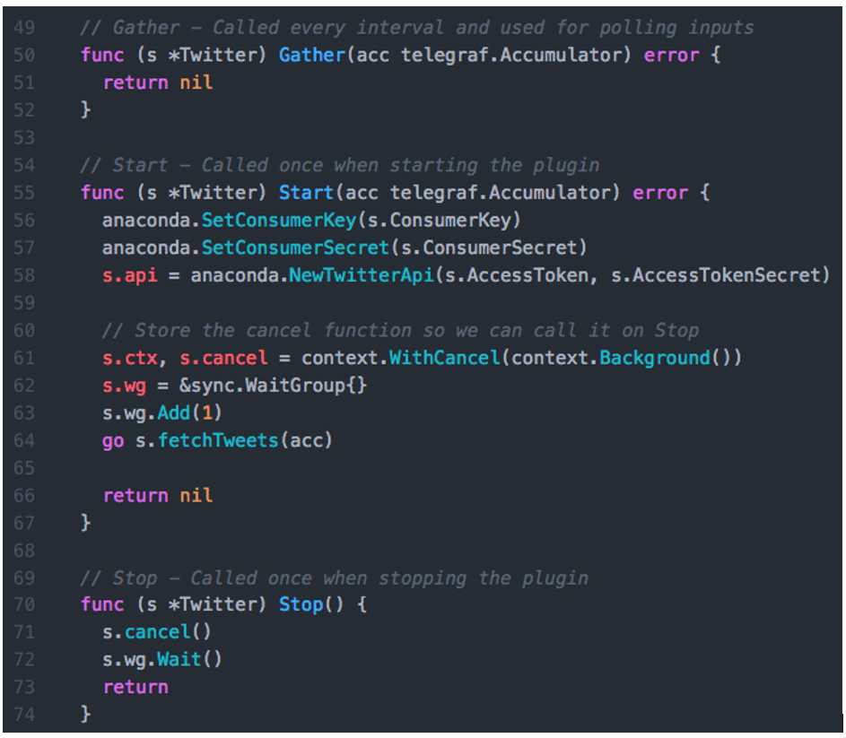 The CONTRIBUTING file in the Telegraf repo gives us the basic structure of an input plugin, so let’s copy that into our twitter.go file and get started. We will add the additional Start and Stop functions as we go.