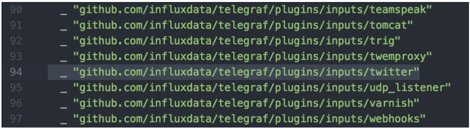 Next, we need to add a line to the plugins/inputs/all/all.go file so that Telegraf knows it needs to load the code for our twitter package. Add the line