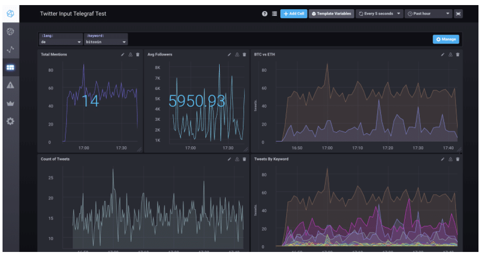 The cryptocurrency market is hotter than ever. Bitcoin and Ethereum are two of the most popular cryptocurrencies out there, and their price is heavily influenced by speculation fueled through news articles and public statements from thought leaders. To help you keep track of the ever-changing world of crypto, I’m going to walk you through how to build a custom service input plugin for Telegraf that will monitor keywords from a Twitter live stream and send them into InfluxDB. We’ll use Chronograf to explore the data and build a simple dashboard. Finally, we will end up with a dashboard that looks similar to the following.