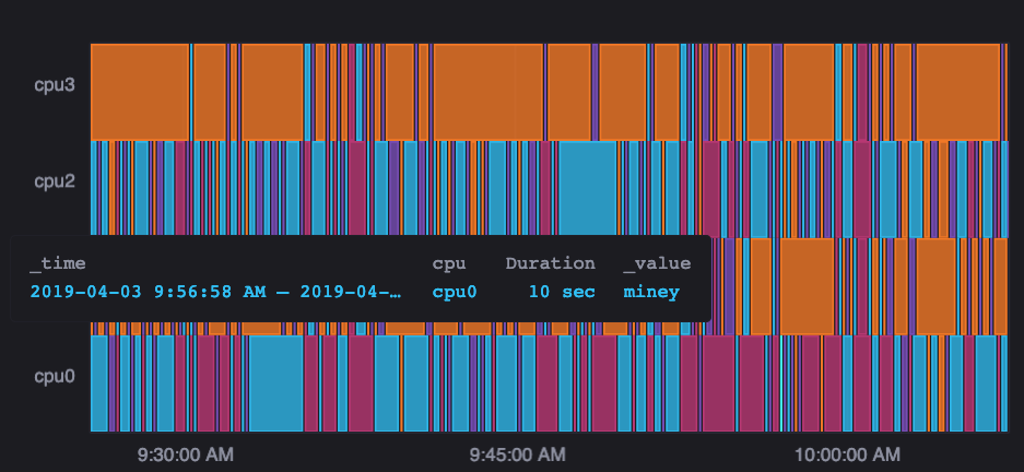 One of the first issues we ran into was that we didn’t have a set of raw data that worked for our graph. As we mentioned earlier, all of the other graph types use numeric values. Therefore, the dummy data set that existed in Giraffe at the time didn’t work for our purposes. To solve this problem, we wrote a script to convert the values of the existing dummy data set to one with string values by putting the numeric values into ranges with string names. This resulted in a data set with each series being a CPU and each value interval mapping to a color that changes over time.