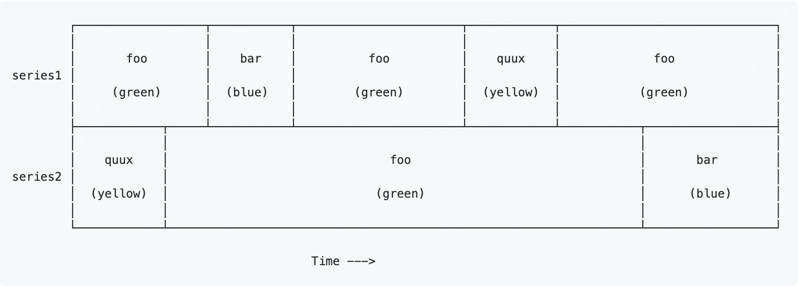 The first thing we did was create a simple mosaic graph with the Canvas element to figure out what shape we would need the data to be in to draw our graph. While looking at the data other graphs were displaying in Giraffe, we saw that the data we received would contain multiple columns including time, value, series name, and potentially other data. Each row of data would have a timestamp and the value of the series at that exact time. For our graph, we would have to organize this data in terms of intervals. Since we wanted to display how long a value (ex. “foo”) lasted, we would need to know when “foo” became the value and when the value changed again. Therefore, we would need to create a table that stored the start and end times along with the value and series name for each interval.