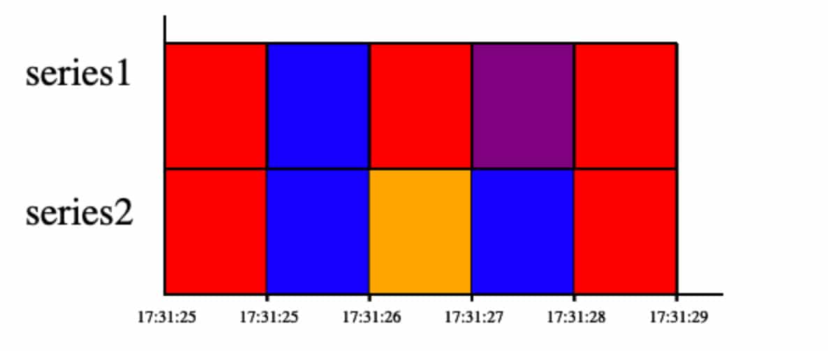 The first question we had to ask ourselves was what this visualization should be called. The original request didn’t refer to the graph type by name, so we did some research. We considered graph types such as Gantt, timeline, and state but eventually settled on a mosaic graph. A mosaic graph visualizes data for two or more qualitative variables in our case, series and value. We chose this graph type because even though our graph is a little more specialized than a mosaic, we wanted to make sure it fits all the requirements of whatever graph we chose. Also, unlike the other possibilities, mosaics are a common enough type of graph that people should recognize the name and have some idea of what it will be used for.