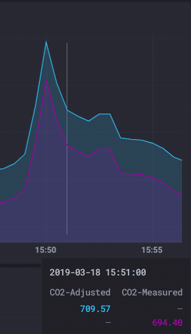 And now I have a graph that shows the raw, measured CO2 value and the compensated CO2 value! All done on-the-fly using Flux’s cross-measurement math!