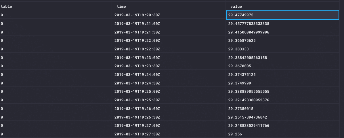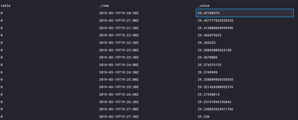 First I’ve defined my reference temperature and pressure values. The reference temperature is usually 25ºC, converted to Kelvin, and the reference Pressure is sea level. I then query values of the Measured Temperature Values and store it in a table called ‘Tmeas’. If I yield() on this table, I’ll see my temperature values: