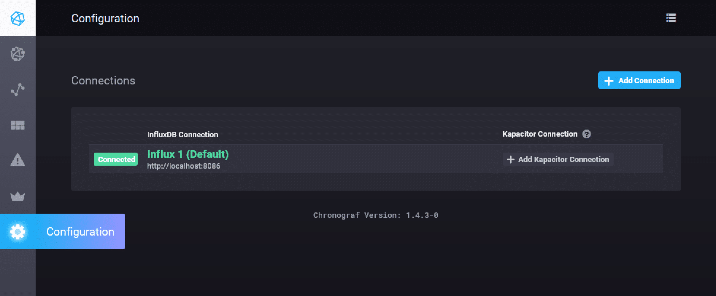 The defaults provided should work for us, so we can click “Add Connection”, after which we should see the main Chronograf interface. We also want to connect our Kapacitor instance at this time; first, navigate to the “KAPACITOR” section of the page.