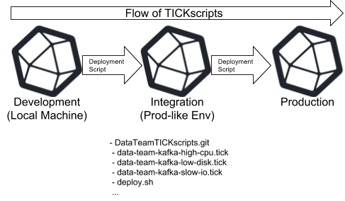 Let’s start with deployment environments. Developing TICKscripts should be handled like any other type of code in your organization, and you should never edit scripts directly in production. Most of our larger users have at least three environments up and running: a local development environment, an integration environment, and a production environment. You may have more, but with any less you will greatly increase your chances of rolling out scripts that don’t function or monitor properly. All new scripts or changes flow from left to right and never the other way around, no matter how small.