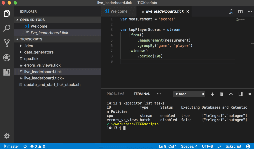 In order to get the most out of Kapacitor (the ‘K’ of the TICK Stack) and the monitoring and alerting it provides, you and your team will need to write TICKscripts. TICKscript is a simple yet powerful way to aggregate, analyze, and alert on the data flowing through InfluxDB. In this post, I am going to walk through the various tools available for writing TICKscripts and highlight some common patterns I’ve seen for organizing the development process for scripts. Let’s start off by highlighting some of the development tools available for writing TICKscripts. The plugins for the various editors and IDEs have been contributed by the community and are not maintained by InfluxData. If you have a favorite editor that might be missing a TICKscript editor, we encourage you to create one and share it in the Community page.