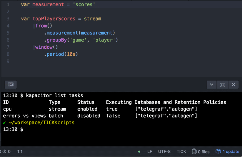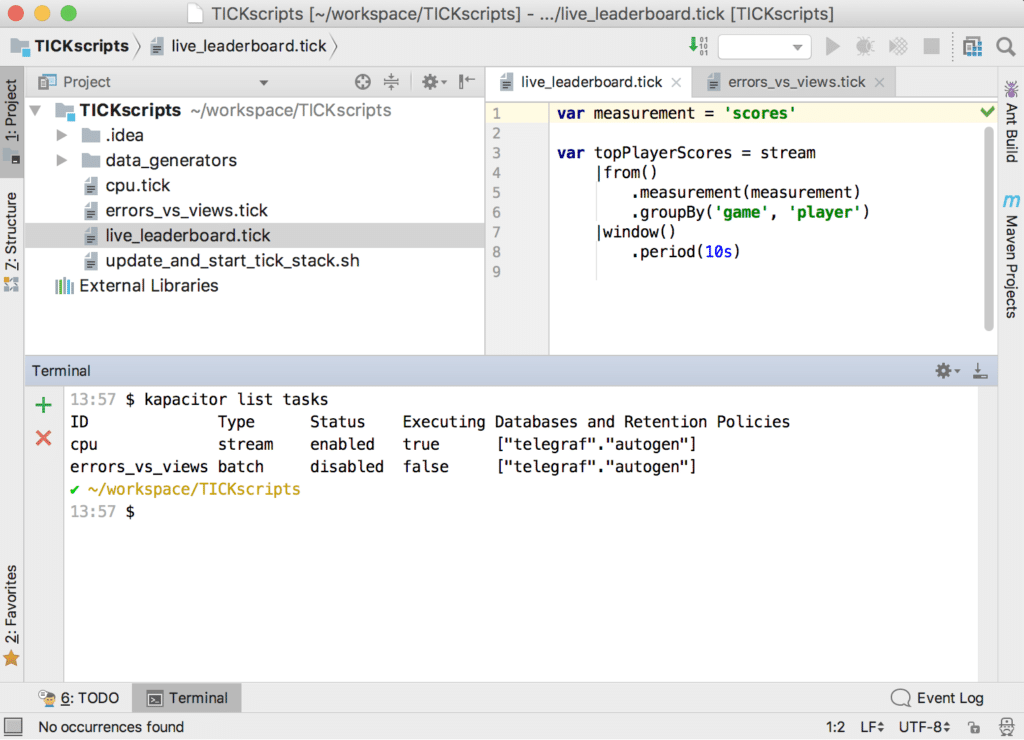 The Jetbrains Intellij platform also has support for TICKscript editing courtesy of Vladislav Rassokhin and his intellij-kapacitor plugin. This can be used on any Intellij based IDE including GoLand or IDEA. Like the Atom plugin, it has syntax highlighting and the built-in terminal panel makes it easy to update scripts in Kapacitor all in the same window. You can also jump to variable definitions quickly using command-click, just like writing Java or Go code.