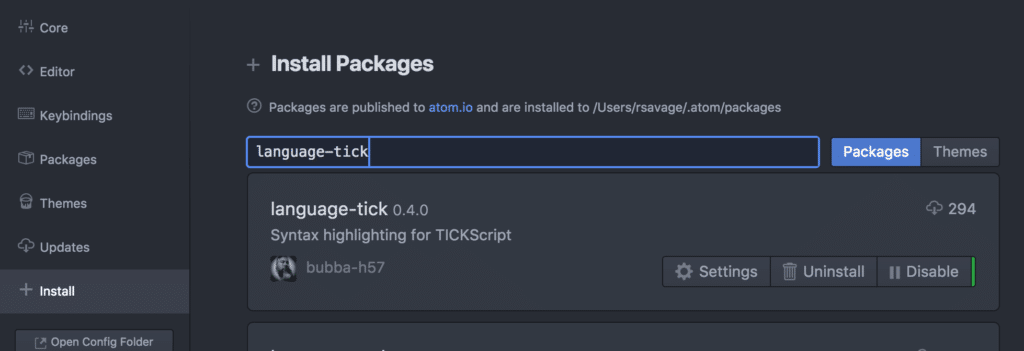 Atom is an extremely flexible open-source text editor that many developers love using. Bubba Hines built a nice Atom package for TICKscript syntax highlighting. Installation is quick and easy via the Atom package installer, just search for language-tick and you’re all set. It doesn’t automatically format your scripts, but the syntax highlighting is helpful for quickly finding issues. If you’re looking for everything in one screen, you could install the platformio-atom-ide-terminal plugin and use it for testing and installing your scripts in Kapacitor.