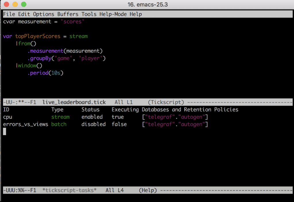 Of course, if we talk about Vim, we need to give equal time to Emacs. Marc Sherry has put together a pretty awesome Emacs major mode for TICKscript files and shared it with the community. In addition to syntax highlighting and formatting, it also allows you to run common Kapacitor functions through Emacs commands. You can find a list of commands in the README file.