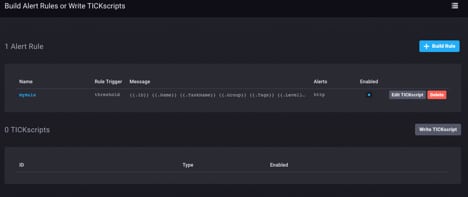 Once you have created your alert, you can view and copy the actual TICKscript. Go back to the Alert Rules page and select the “Edit TICKscript” button for your alert.