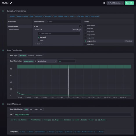 Alerts are at the core of what Kapacitor does and is the most common type of workload for Kapacitor in the wild. I’m going to let you in on a secret for creating great alert scripts: Use Chronograf to stub them out. Chronograf has the ability to visually create alerts.