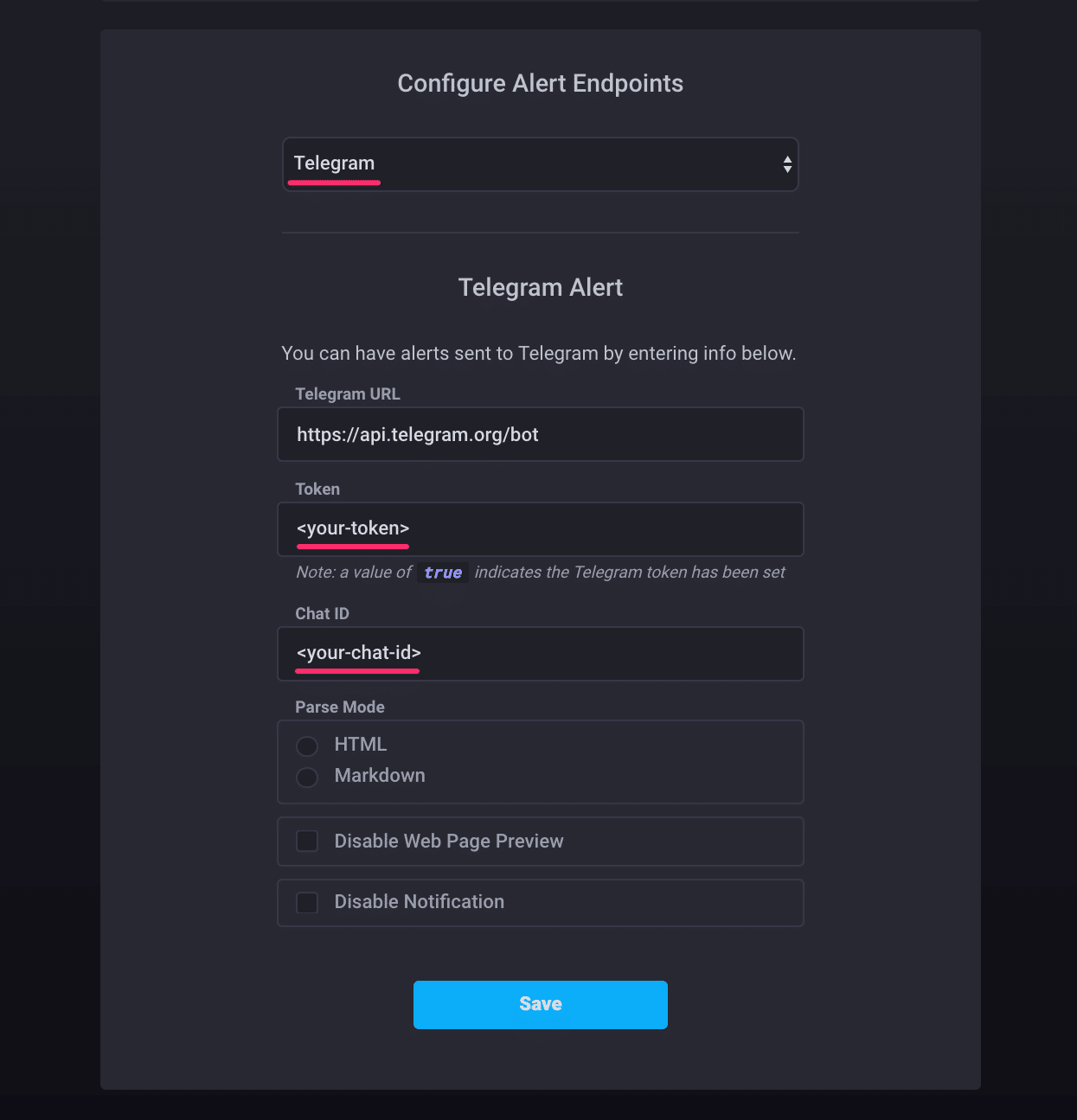 2. In the Configure Alert Endpoints section, select Telegram from the dropdown menu.