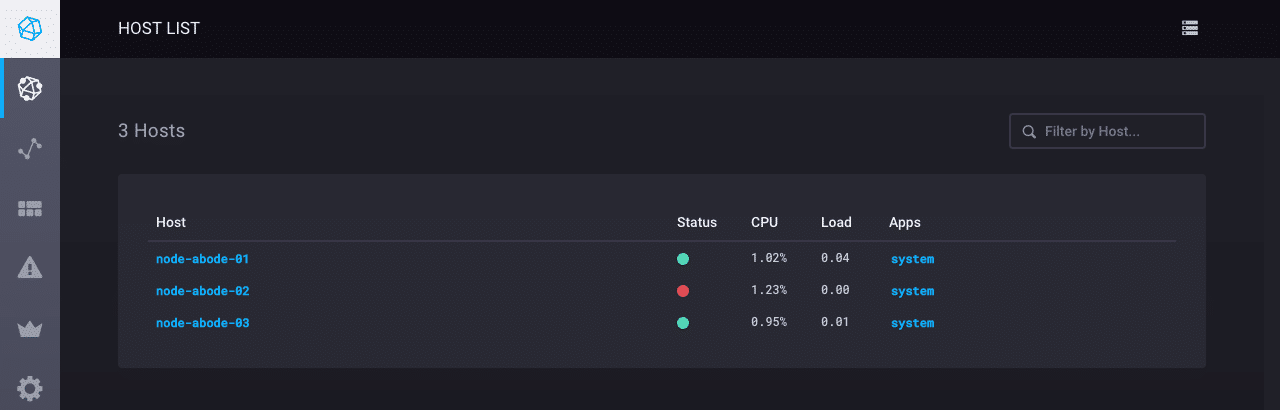 On your Host List page, it looks like Chronograf hasn’t received Telegraf data from node-abode-02 for at least the past minute.
