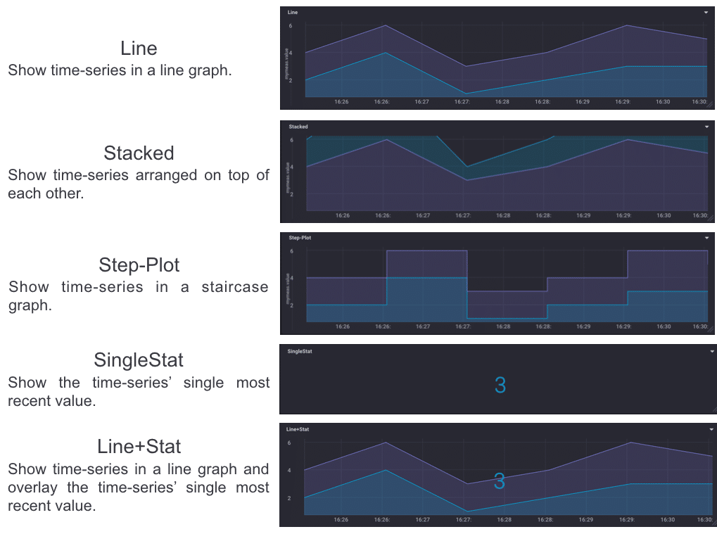 A: Currently, Chronograf supports five visualization types: line, stacked, step-plot, singleStat, and line+stat.