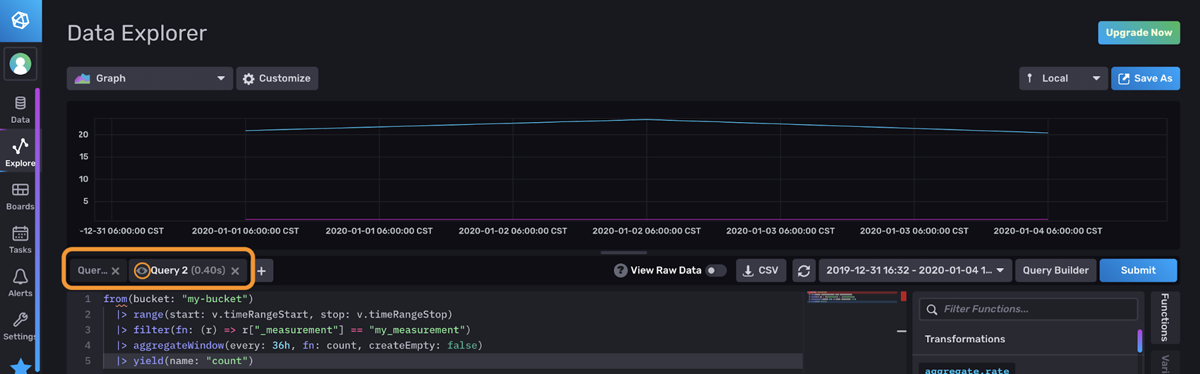 InfluxDB v2.0 is a mature and unified product. To learn how to write Flux, you really want to learn how to use the InfluxDB native UI and vice versa. The UI is designed to enable you to create Flux scripts, tasks, and alerts without writing any Flux yourself. The most useful part of the InfluxDB UI for learning how to write Flux scripts is the Data Explorer. Within the Data Explorer, you have access to two Flux writing tools: Flux Query Builder and Flux Script Editor.