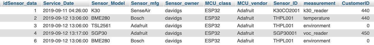 So now my sensor metadata database has some information about each sensor I’m running here, as well as some ‘customer data’ about who owns the sensors. Now it’s time to pull this all into something useful.