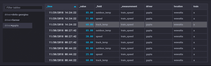 In the last post, I used a measurement called cpu_load_short with various tags and fields. In this post I’ve seeded my InfluxDB database, called trains, with train data. The measurement is train_speed. My tags are driver, location, and train. My fields are outdoor_temp, speed, and track_temp. Below you can see a sample of data for three different drivers.